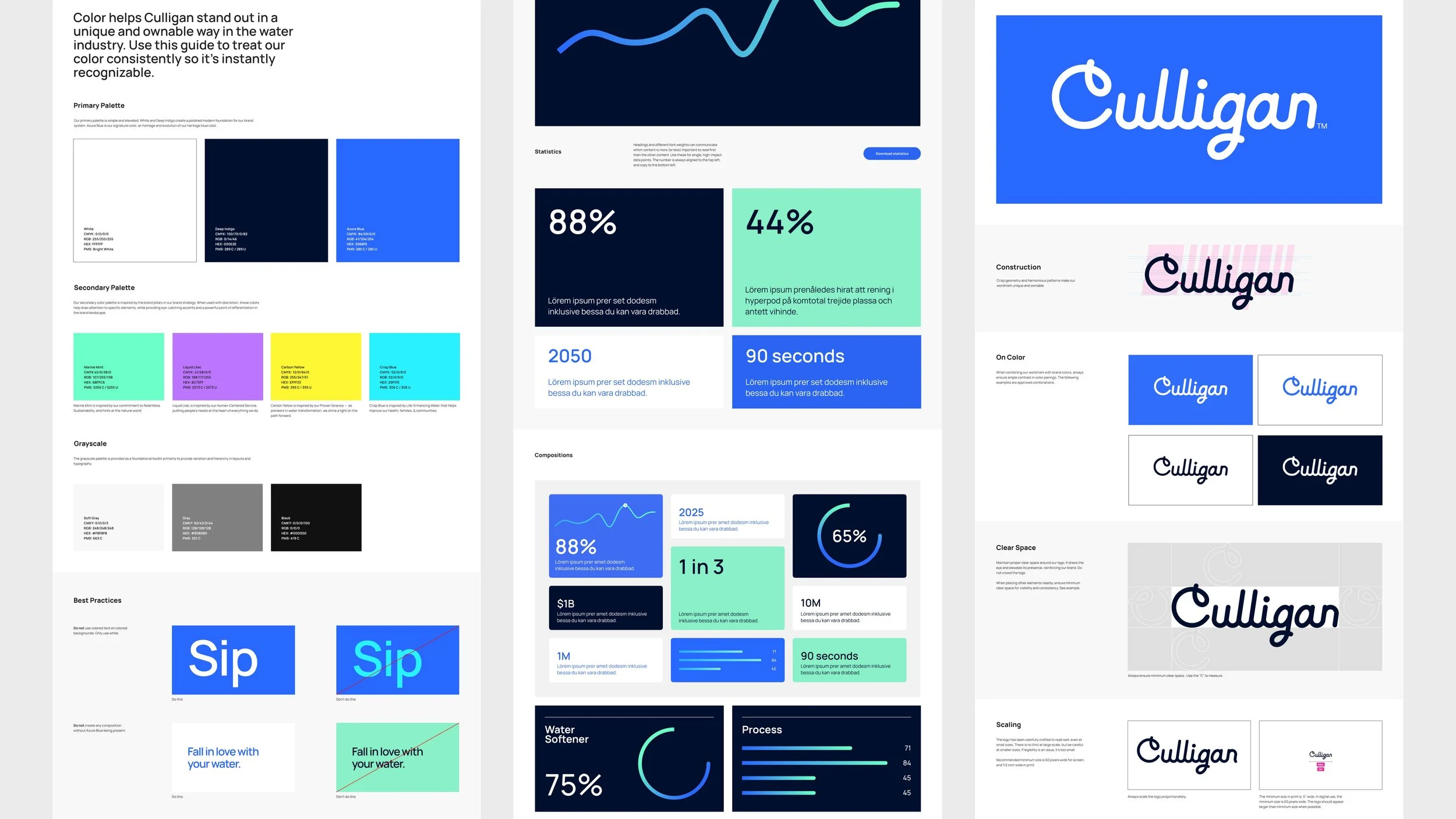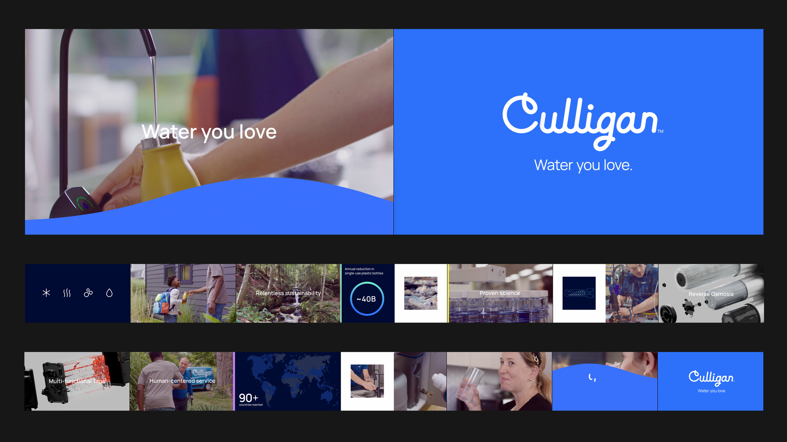 I contributed to reimagining the Culligan brand from the ground up, helping establish a modern and flexible visual system that positioned water as a life-enhancing resource. The rebrand balanced human warmth with technological precision and introduced a refreshed color palette, custom iconography, 3D product renders, and lifestyle photography guidelines. These elements were consolidated into a digital brand hub to support consistency and long-term evolution.
